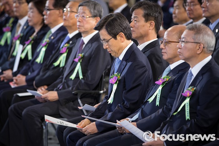 (서울=포커스뉴스) 황교안(오른쪽 세 번째) 국무총리가 17일 오전 서울 영등포구 여의도 국회의사당 중앙홀에서 열린 제68주년 제헌절 경축식에 참석하고 있다.