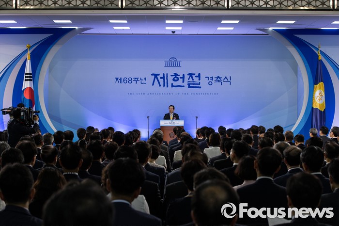 (서울=포커스뉴스) 정세균 국회의장이 17일 오전 서울 영등포구 여의도 국회의사당 중앙홀에서 열린 제68주년 제헌절 경축식에 참석해 경축사를 하고 있다.