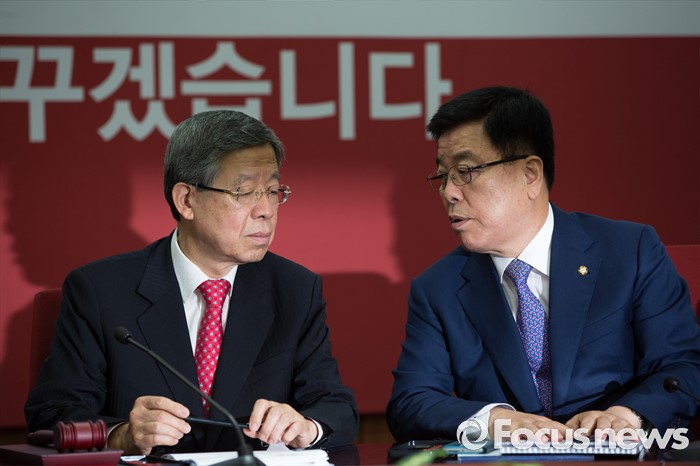 (서울=포커스뉴스) 김희옥(왼쪽) 새누리당 혁신비상대책위원장과 김광림 정책위의장이 18일 오전 서울 여의도 새누리당사에서 열린 혁신비상대책위원회의에 참석해 대화 하고 있다.