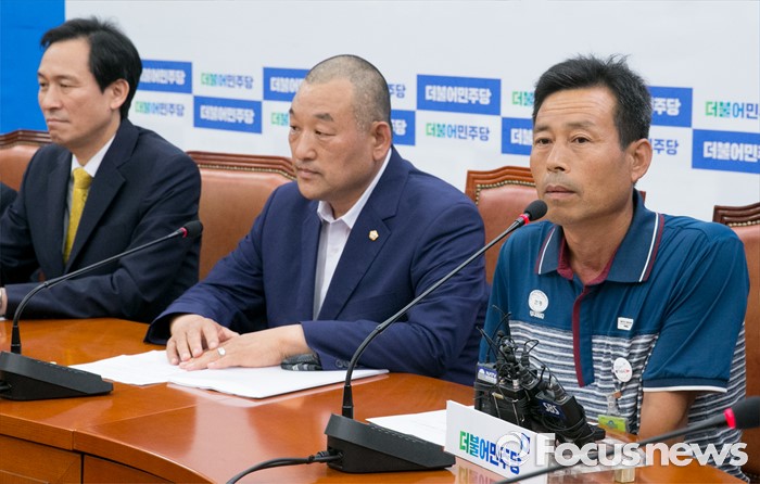 (서울=포커스뉴스) 18일 오전 서울 여의도 국회에서 열린 우상호 더불어민주당 원내대표와 사드반대 전국대책회의 등 관련단체 면담에 참석한 이재동(오른쪽 첫번쨰) 성주군 농민회장이 발언하고 있다.