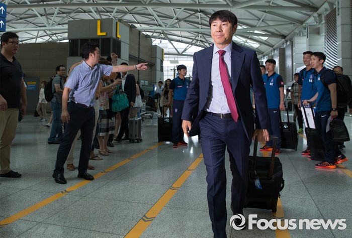 (인천공항=포커스뉴스) 2016년 리우데자네이루 올림픽 메달에 도전하는 신태용 올림픽 축구 국가대표팀 감독이 18일 오후 인천국제공항에서 브라질 상파울루로 출국하기 위해 이동하며 취재진을 향해 인사하고 있다.