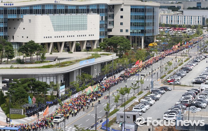 (세종=포커스뉴스) 전국건설기계연합회 구성원들이 18일 오후 세종시 정부세종청사 국토교통부 앞에서 굴삭기 수급조절을 통해 임대사업자를 보호할 것을 촉구하며 가두행진을 하고 있다.