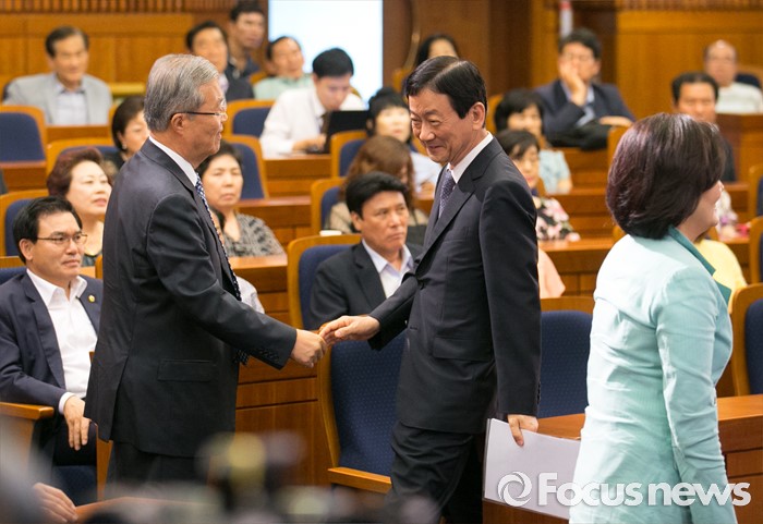 (서울=포커스뉴스) 18일 오후 서울 여의도 국회 헌정기념관에서 한국적 제3의 길 후원으로 열린 '개헌을 말하다 의원 대담, 어떤 헌법인가?'에 참석한 김종인(왼쪽) 더불어민주당 비대위 대표가 대담에 나선 진영 의원과 악수하고 있다.