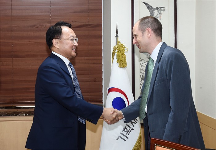 (서울=포커스뉴스) 유일호 부총리 겸 기획재정부 장관이 18일 광화문 정부서울청사에서 에릭 월시 주한 캐나다대사와 면담에 앞서 악수하며 인사를 나누고 있다. <사진제공=기획재정부>