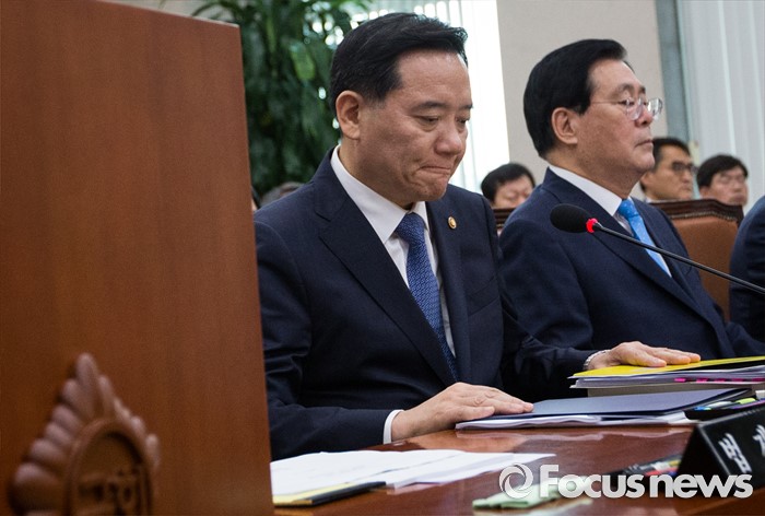 (서울=포커스뉴스) 김현웅 법무부 장관이 18일 오후 서울 여의도 국회에서 열린 법제사법위원회 전체회의에 출석해 참담한 표정을 짓고 있다.