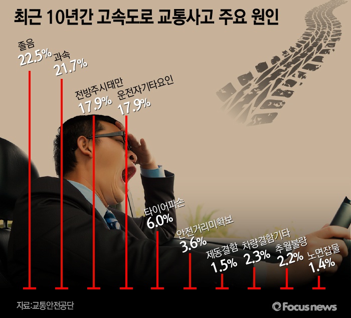 (서울=포커스뉴스) 최근 10년간 고속도로 교통사고 발생원인별 비율을 보면 졸음운전이 22.5%로 가장 높은 비중을 차지했다.