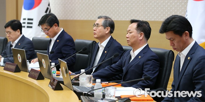 (세종=포커스뉴스) 19일 오전 세종시 정부세종청사 국무회의장에서 서울-세종 간 영상회의로 열린 국무회의에 참석한 국무위원들이 황교안 국무총리의 발언을 경청하고 있다. 왼쪽부터 정진엽 보건복지부장관, 이기권 고용노동부장관, 정재찬 공정거래위원장,김동극 인사혁신처장, 손문기 식품의약품안전처장.