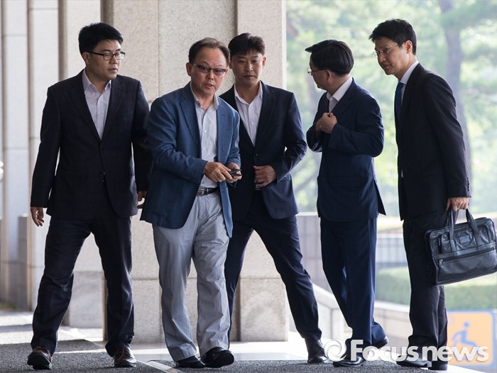 (서울=포커스뉴스) 롯데케미칼 270억원대 소송 사기에 연루된 혐의를 받는 기준(왼쪽 두번째) 전 롯데물산 사장이 19일 오전 서울중앙지검에 피의자 신분으로 출석하고 있다.
