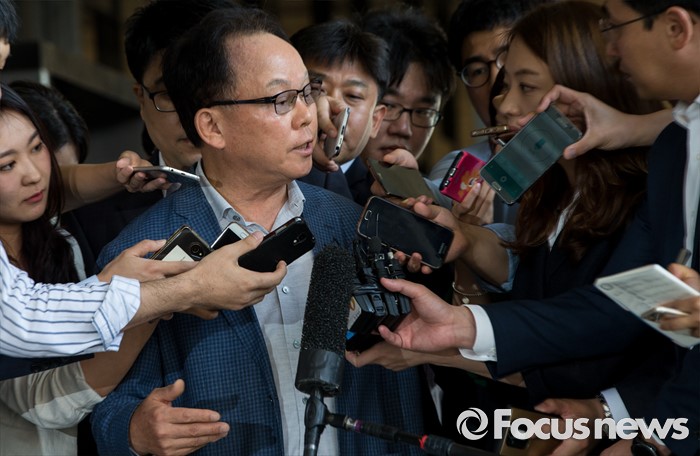 (서울=포커스뉴스) 롯데케미칼 270억원대 소송 사기에 연루된 혐의를 받는 기준 전 롯데물산 사장이 19일 오전 서울중앙지검에 피의자 신분으로 출석, 취재진의 질문에 답하고 있다.