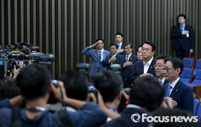 (서울=포커스뉴스) 19일 오전 서울 여의도 국회에서 열린 새누리당 의원총회에 참석한 정진석 원내대표 등 의원들이 국기에 대한 경례를 하고 있다.