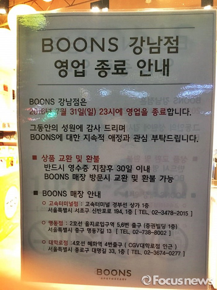 분스 강남점에서 구매한 상품을 교환이나 환불해야 하는 소비자는 아직 영업 중인 고속터미널점, 명동점, 대학로점 등으로 가면 서비스 받을 수 있다.