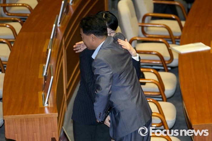 (서울=포커스뉴스) 19일 오전 서울 여의도 국회에서 열린 344회 국회(임시회) 1차 본회의, 사드(THAAD·고고도미사일방어체계) 배치에 대한 긴급현안질문에 참석한 박선숙, 이용주 국민의당 의원이 포옹을 하고 있다.