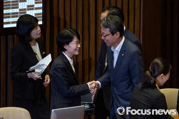 (서울=포커스뉴스) 김상식(오른쪽) 국민의당 정책위의장과 박선숙 국민의당 의원이 19일 오전 서울 여의도 국회에서 열린 제344회 국회(임시회) 1차 본회의에 참석해 동료 의원들과 대화 하고 있다.