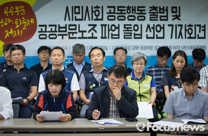(서울=포커스뉴스) 19일 오전 서울 중구 민주노총 대회의실에서 시민 사회 공동행동 출범 및 공공부문노조 파업 돌입 선언 기자회견이 열리고 있다. 공공성 강화와 공공부문 성과·퇴출제 저지 시민사회공동 행동은 9월 27일까지 성과연봉제, 민영화 정책 중단이 없으면 공공기관 노동자 6만명이 무기한 전면 파업에 들어가겠다고 밝혔다.