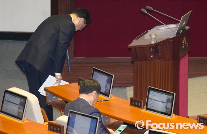 (서울=포커스뉴스) 19일 오전 서울 여의도 국회에서 열린 344회 국회(임시회) 1차 본회의, 사드(THAAD·고고도미사일방어체계) 배치에 대한 긴급현안질문에 참석한 유일호 경제부총리 겸 기획재정부 장관이 답변에 앞서 인사하고 있다.