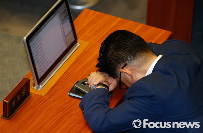 (서울=포커스뉴스) 19일 오후 서울 여의도 국회에서 열린 344회 국회(임시회) 1차 본회의, 사드(THAAD·고고도미사일방어체계) 배치에 대한 긴급현안질문에 참석한 박지원 국민의당 비상대책위원장이 고개 숙인 채 엎드리고 있다.