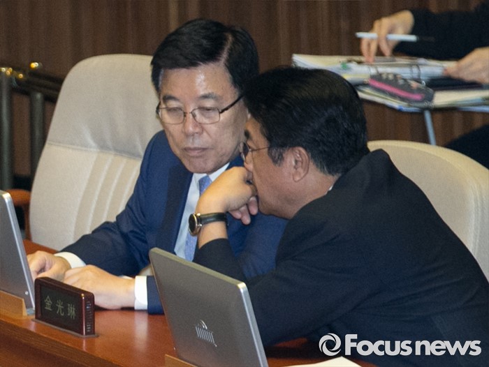 (서울=포커스뉴스) 19일 오후 서울 여의도 국회에서 열린 344회 국회(임시회) 1차 본회의, 사드(THAAD·고고도미사일방어체계) 배치에 대한 긴급현안질문에 참석한 정진석(오른쪽) 새누리당 원내대표와 김광림 정책위의장이 대화하고 있다.