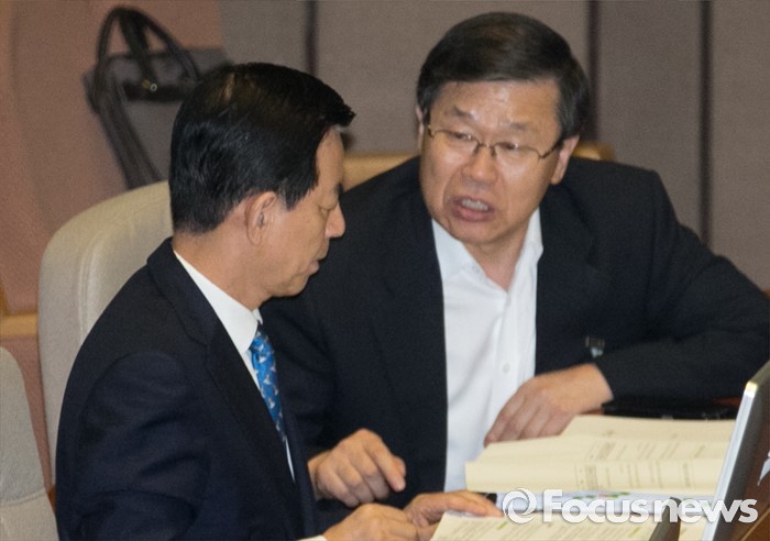 (서울=포커스뉴스) 19일 오후 서울 여의도 국회에서 열린 344회 국회(임시회) 1차 본회의, 사드(THAAD·고고도미사일방어체계) 배치에 대한 긴급현안질문에 참석한 한민구(왼쪽) 국방부 장관과 황희종 기획조정실장이 대화하고 있다.