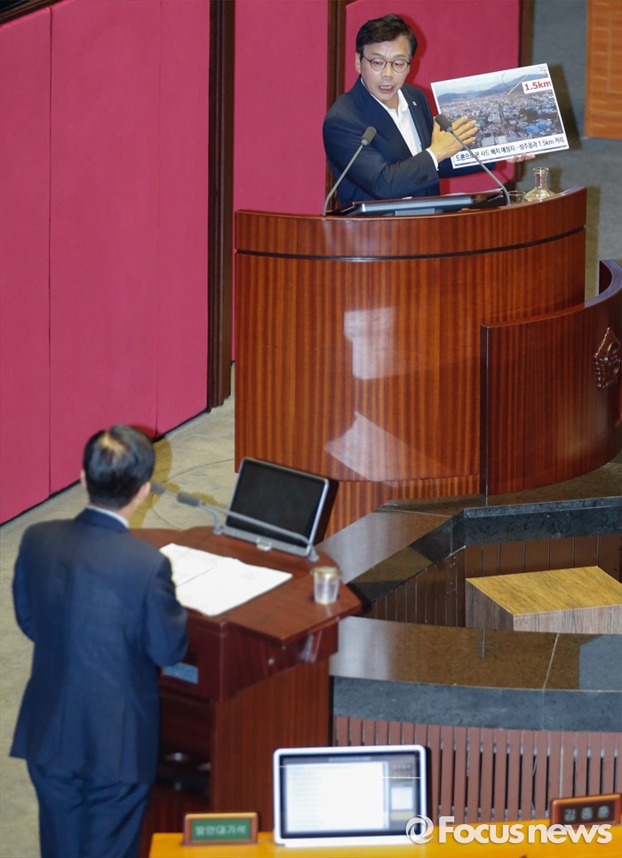 (서울=포커스뉴스) 19일 오후 서울 여의도 국회에서 열린 344회 국회(임시회) 1차 본회의, 사드(THAAD·고고도미사일방어체계) 배치에 대한 긴급현안질문에 참석한 이완영 새누리당 의원이 드론으로 촬영한 사드배치 예정지 사진을 들고 한민구 국방부 장관에게 질문하고 있다.
