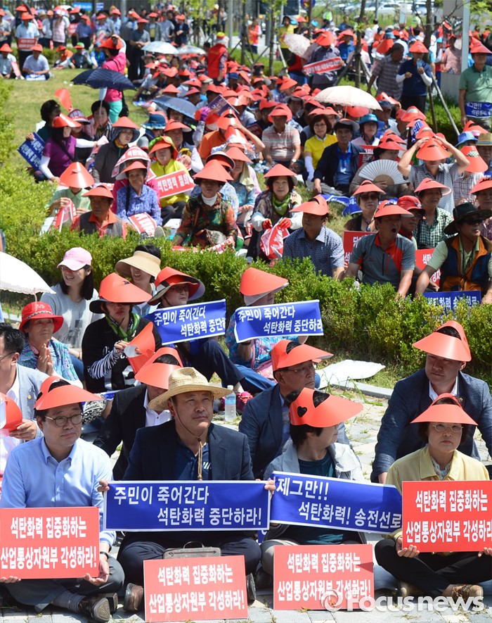 (세종=포커스뉴스) 충남 당진시민들이 19일 세종시 정부세종청사 산업통상자원부 앞에서 석탄화력발전소인 당진 에코파워 건설 철회를 촉구하고 있다.