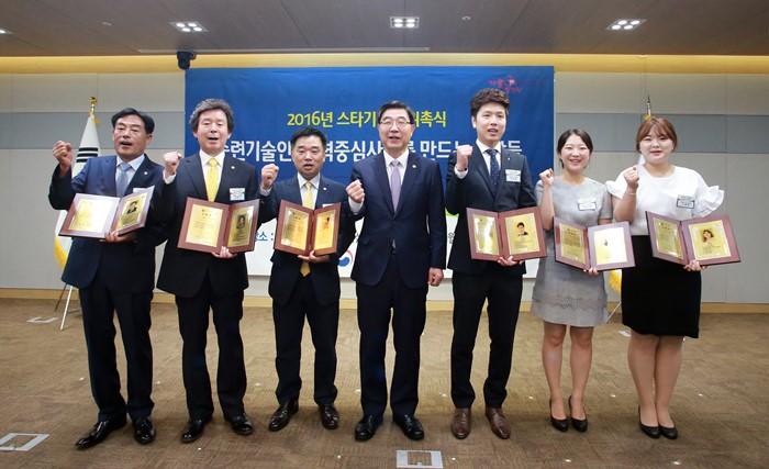 (세종=포커스뉴스) 이기권(오른쪽 네 번째) 고용노동부장관이 19일 세종시 정부세종청사 고용노동부 대회의실에서 열린 2016 스타기술인 홍보대사 위촉식에서 위촉장을 전달하고 기념촬영하고 있다. <사진제공=고용노동부>