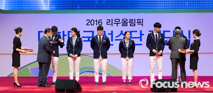 (서울=포커스뉴스) 19일 오후 서울 송파구 올림픽공원 올림픽홀에서 열린 2016 리우올림픽 대한민국 선수단 결단식에서 김정행-강영중 대한체육회장이 선수단 대표에게 태극기를 수여하고 있다.