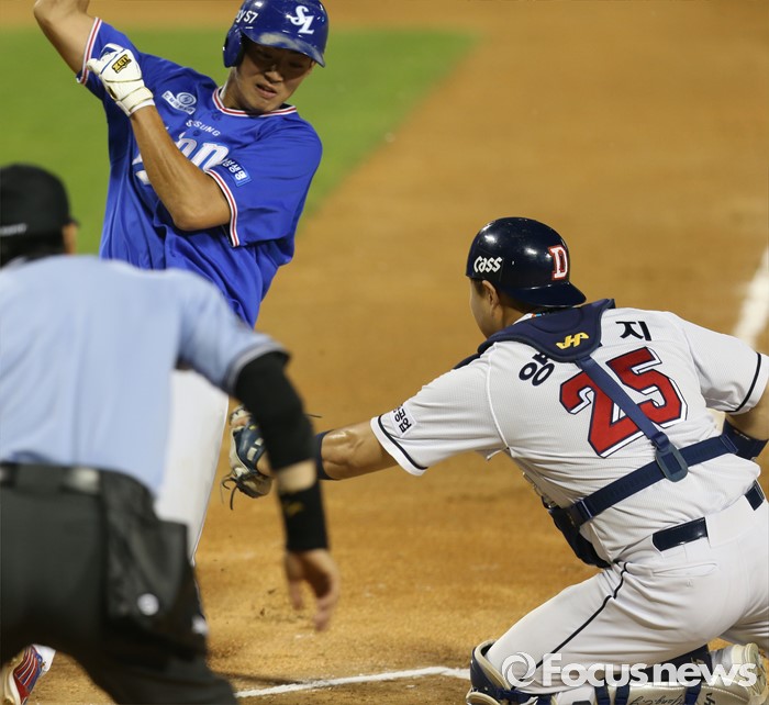 (서울=포커스뉴스) 19일 서울 잠실구장에서 열린 2016 프로야구 삼성-두산 경기 6회초 1사 3루에서 삼성 박해민의 2루수 앞 땅볼때 3루주자 구자욱이 홈에서 태그아웃되고 있다.