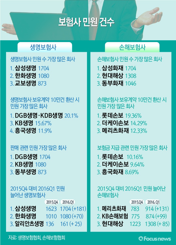 (서울=포커스뉴스) 생명보험협회와 손해보험협회에 공시한 국내 생명보험사(생보사)와 손해보험사(손보사)의 자율 민원 공시 자료를 분석한 결과 민원 건수가 2015년 4분기 대비 2016년 1분기 증가 건이 가장 높은 생보사는 삼성생명이며, 손보사는 메리츠화재인 것으로 나타났다. 작년 4분기 삼성생명의 고객 민원은 1623건이다. 메리츠화재가 작년 4분기 대비 올해 1분기 민원 수가 131건이나 늘었다. 작년 4분기 민원 수는 783건이었으나 올 1분기 914건으로 늘었다.