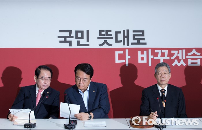 (서울=포커스뉴스) 20일 오전 서울 여의도 국회에서 열린 새누리당 혁신비상대책위원회의에 참석한 정진석(가운데) 원내대표, 박명재(왼쪽) 사무총장이 대화하고 있다. 오른쪽은 김희옥 위원장.