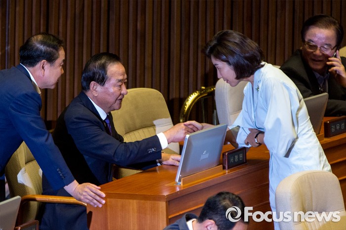 (서울=포커스뉴스) 새누리당 8.9 전당대회 불출마를 선언한 서청원 의원이 20일 오전 서울 여의도 국회에서 열린 344회 국회(임시회) 2차 본회의, 사드(THAAD, 고고도미사일방어체계) 배치에 대한 긴급현항질문에 참석해 나경원 의원과 악수하고 있다.