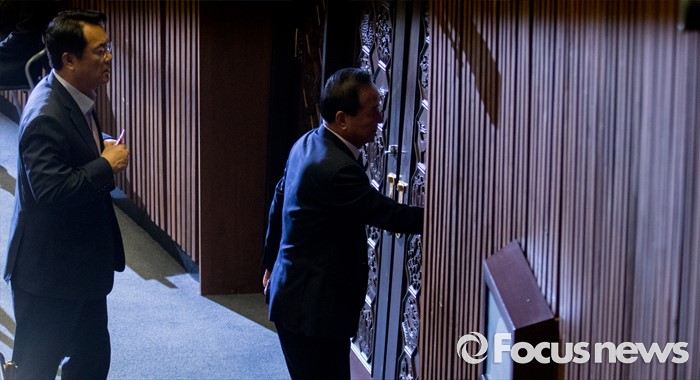 (서울=포커스뉴스) 20일 오전 서울 여의도 국회에서 열린 344회 국회(임시회) 2차 본회의, 사드(THAAD·고고도미사일방어체계) 배치에 대한 긴급현안질문에 참석한 정진석(왼쪽) 새누리당 원내대표와 서청원 의원이 대화를 위해 이동하고 있다.