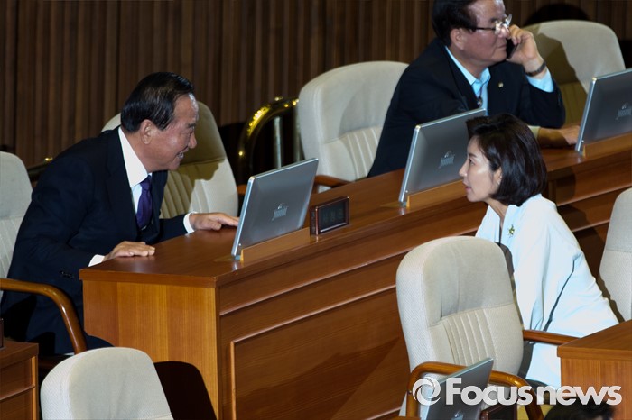 (서울=포커스뉴스) 새누리당 8.9 전당대회 불출마를 선언한 서청원(왼쪽) 의원이 20일 오전 서울 여의도 국회에서 열린 344회 국회(임시회) 2차 본회의, 사드(THAAD, 고고도미사일방어체계) 배치에 대한 긴급현안질문에 참석해 나경원 의원과 대화 하고 있다.
