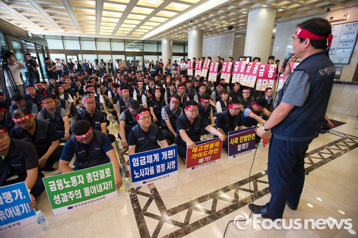 (서울=포커스뉴스) 20일 오전 서울 중구 은행회관에서 금융노조의 '성과연봉제 도입 관련 총파업 1차 결의대회' 가 열리고 있다.