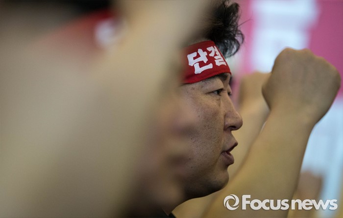(서울=포커스뉴스) 20일 오전 서울 중구 은행회관에서 금융노조의 '성과연봉제 도입 관련 총파업 1차 결의대회'가 열리고 있다.