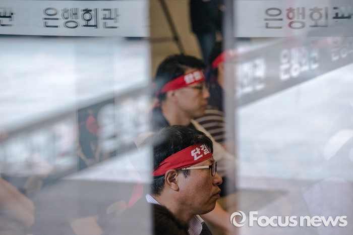 (서울=포커스뉴스) 20일 오전 서울 중구 은행회관에서 금융노조'성과연봉제 도입 관련 총파업 1차 결의대회'가 열리고 있다.