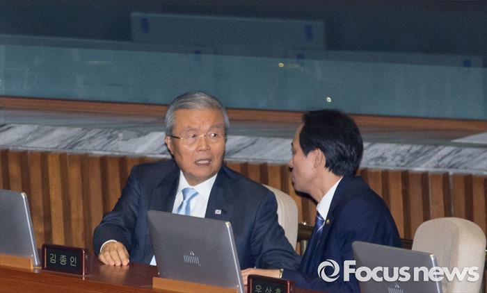 (서울=포커스뉴스) 20일 오전 서울 여의도 국회에서 열린 344회 국회(임시회) 2차 본회의, 사드(THAAD·고고도미사일방어체계) 배치에 대한 긴급현안질문에 참석한 김종인(왼쪽) 더불어민주당 비대위 대표와 우상호 원내대표가 대화하고 있다.