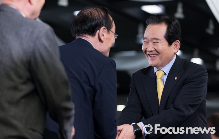 (서울=포커스뉴스) 정세균 국회의장이 20일 오전 서울 종로구 세종문화회관에서 열린 한국방송기자클럽 초청 토론회에서 참석자들과 인사를 나누고 있다.