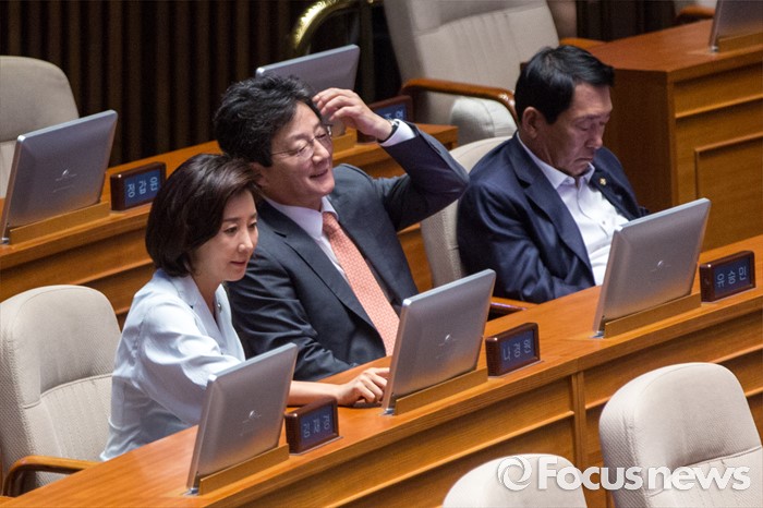 (서울=포커스뉴스) 유승민(가운데) 새누리당 의원과 나경원(왼쪽) 새누리당 의원이 20일 오전 서울 여의도 국회에서 열린 344회 국회(임시회) 2차 본회의, 사드(THAAD, 고고도미사일방어체계) 배치에 대한 긴급현안질문에 참석해 대화 하고 있다.