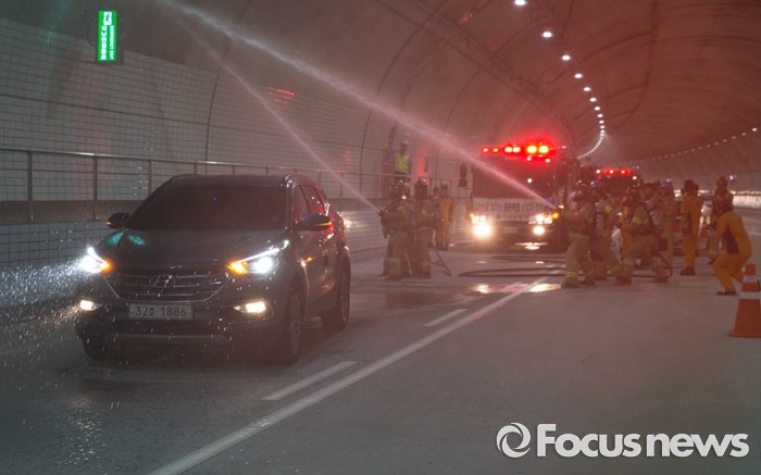 (서울=포커스뉴스) 20일 오후 서울 관악구 봉천터널 내에서 서초소방서, 방배경찰서 대원들이 강남순환도로 화재대응 유관기관 합동훈련을 하고 있다.