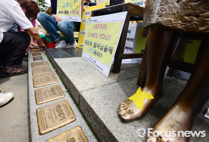 (서울=포커스뉴스) 20일 오후 서울 종로구 옛 일본대사관 앞에서 열린 제1240차 일본군 위안부 문제해결을 위한 정기 수요집회에서 평화의 소녀상 작가 김서경씨가 위안부 할머니들의 이름이 새겨진 동판을 붙이는 평화의 디딤돌 퍼포먼스를 하고 있다.