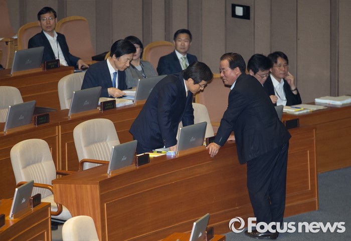 (서울=포커스뉴스) 20일 오후 서울 여의도 국회에서 열린 344회 국회(임시회) 2차 본회의, 사드(THAAD·고고도미사일방어체계) 배치에 대한 긴급현안질문에 참석한 황교안(왼쪽) 국무총리와 정갑윤 새누리당 의원이 대화하고 있다.