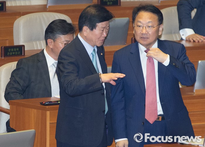(서울=포커스뉴스) 20일 오후 서울 여의도 국회에서 열린 344회 국회(임시회) 2차 본회의, 사드(THAAD·고고도미사일방어체계) 배치에 대한 긴급현안질문에 참석한 유일호(오른쪽) 경제부총리 겸 기획재정부 장관과 박병석 더불어민주당 의원이 대화하고 있다.