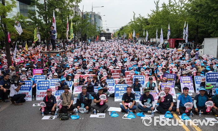 (서울=포커스뉴스) 20일 오후 서울 여의도 산업은행 앞에서 '민주노총 총파업 총력투쟁' 결의대회가 열리고 있다. 이번 결의대회에서 민노총 조합원들은 한상균 민노총 위원장 실형선고, 성과연봉제 등을 규탄했다.