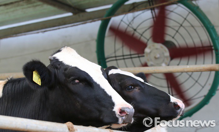 (세종=포커스뉴스) 폭염주의보가 발령된 20일 오후 세종시 한 농장에서 젖소들이 대형 선풍기 바람에 더위를 식히고 있다.
