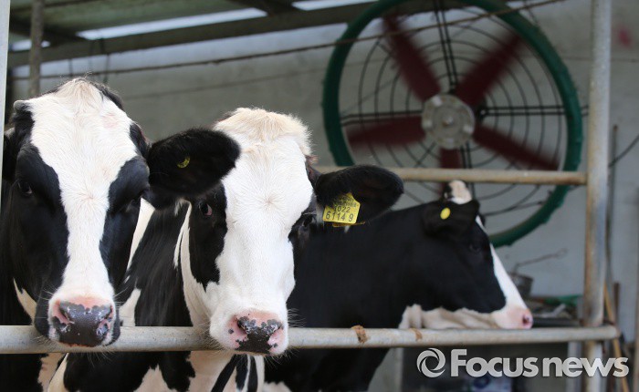 (세종=포커스뉴스) 폭염주의보가 발령된 20일 오후 세종시 한 농장에서 젖소들이 대형 선풍기 바람에 더위를 식히고 있다.