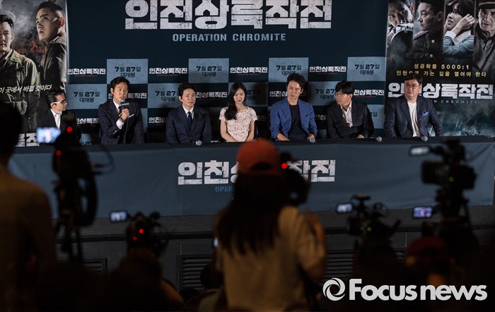 (서울=포커스뉴스) 20일 오후 서울 성동구 왕십리 CGV에서 열린 영화 '인천상륙작전' 언론시사회에 참석한 배우 이정재(왼쪽부터) 이범수, 진세연, 정준호, 박철민이 질의응답 시간을 갖고 있다.