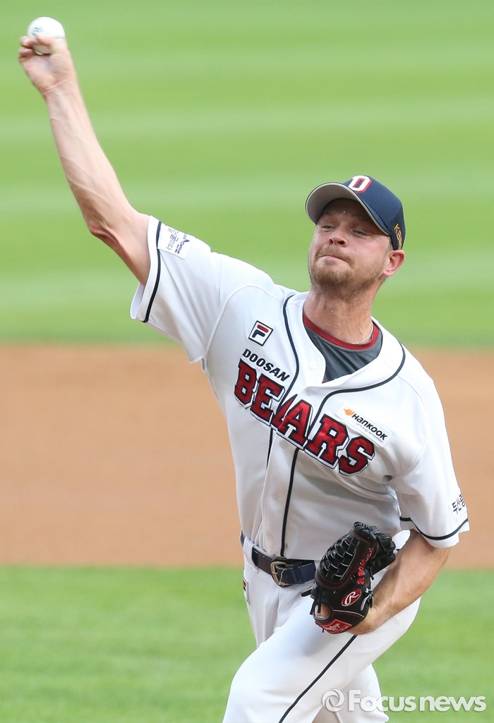 (서울=포커스뉴스) 20일 서울 잠실구장에서 열린 2016 프로야구 삼성-두산 경기에서 1회초 두산 선발투수 보우덴이 투구하고 있다.
