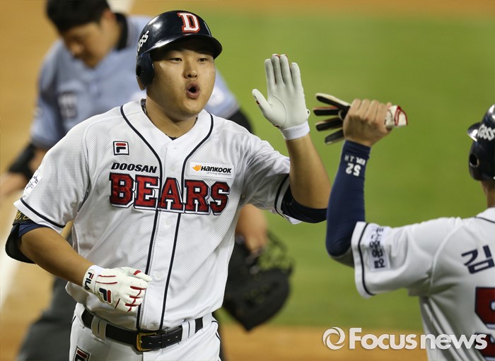(서울=포커스뉴스) 20일 서울 잠실구장에서 열린 2016 프로야구 삼성-두산 경기 7회말 2사 1루에서 두산 대타 오재일이 우월 홈런을 치고 선행주자 김재호의 환영을 받으며 홈인하고 있다.