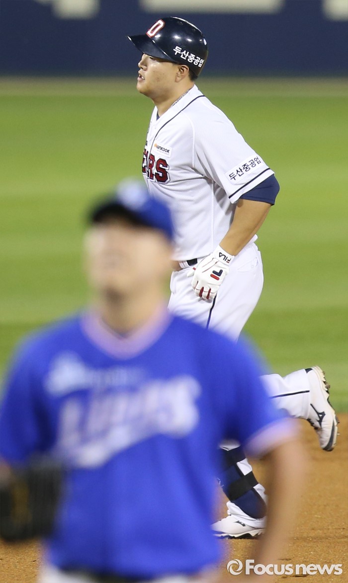 (서울=포커스뉴스) 20일 서울 잠실구장에서 열린 2016 프로야구 삼성-두산 경기 7회말 2사 1루에서 두산 대타 오재일이 우월 홈런을 치고 베이스를 돌고 있다.