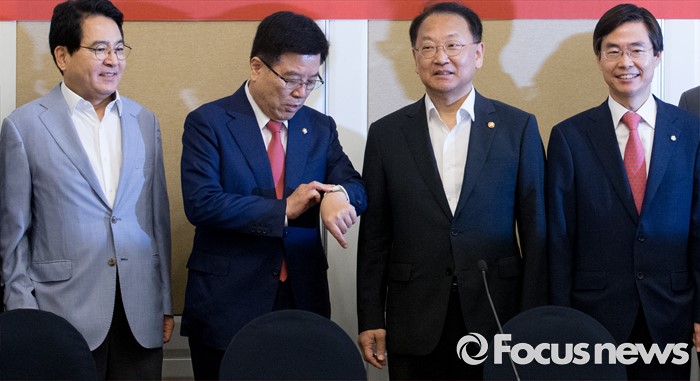(서울=포커스뉴스) 21일 오전 서울 여의도 국회 귀빈식당에서 열린 2016년 세법개정 당정협의에 참석한 유일호 경제부총리 겸 기획재정부 장관과 의원들이 취재진을 향해 포즈를 취하고 있다. 왼쪽부터 심재철 국회 부의장, 김광림 새누리당 정책위의장, 유 부총리, 조경태 기획재정위원장.